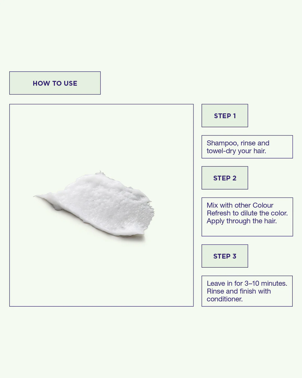 Trinn 2. Bruk hansker og påfør Color Refresh jevnt i hele håret eller på seksjoner der du vil ha fargen, ved hjelp av fingrene eller en kam. For å få den perfekte nyansen kan du blande de forskjellige Color Refresh-fargene med hverandre eller bruke White Mix for å fortynne den foretrukne fargen.