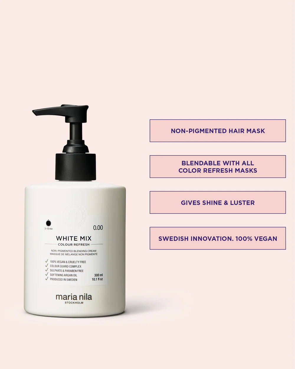 Viktig: Rådfør deg med en profesjonell frisør før du bruker Color Refresh, eller prøv det på en hårstrå først for å forsikre deg om at produktet forformer som ønsket. Maria Nila kan ikke garantere at resultatet blir det samme på hvert hår, da dette avhenger av din spesifikke hårkvalitet og hårhistorie.