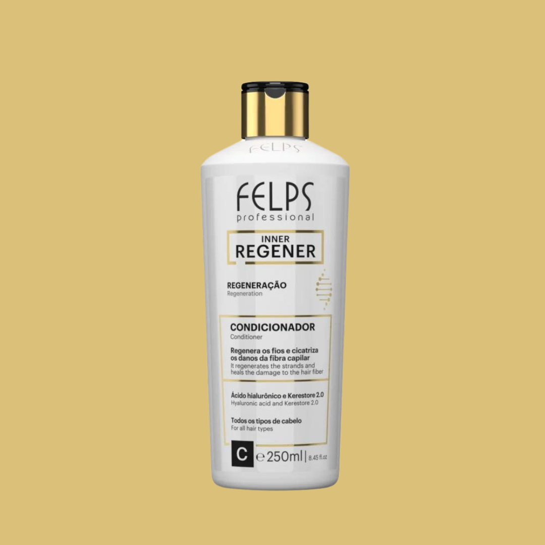 Inner Regener Condicioner med hyaluronsyre, Kerestore 2.0 og plantekollagen, fremmer en intelligent intern regenerering som renser, fyller og tillater større tetthet til ledningene, helbreder skader, regenererer fiberen og styrker den. Den forlenger hydrering, forhindrer tørrhet, porøsitet, skader og flisete tupper forårsaket av kjemiske prosesser og termisk varme, for fyldig, justert, skinnende og sunt hår.